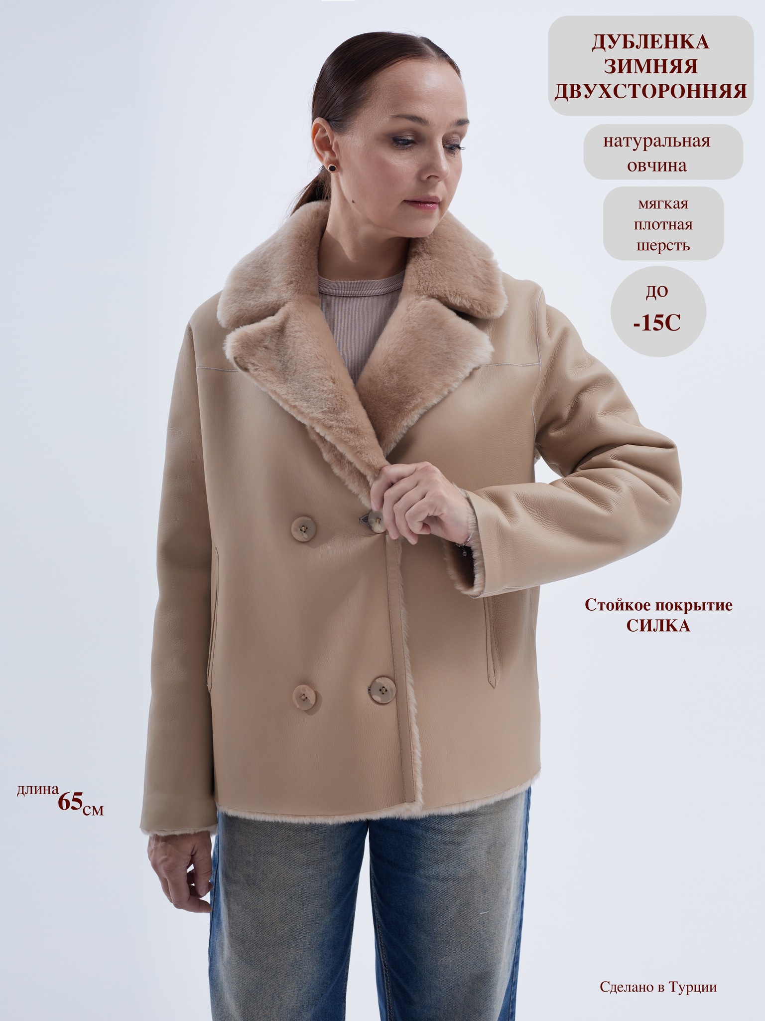 Эта женская дублёнка модели «двубортный пиджак» от NEWBLUE покорит вас своим стилем и уютом. Покрытие "силка" состоит из 100% натуральной овчины создаст ощущение комфорта и тепла, защищая от зимних холодов. Силка не промокает, не продувается, чистится влажной, мягкой тряпочкой, не затирается, не меняет цвет.