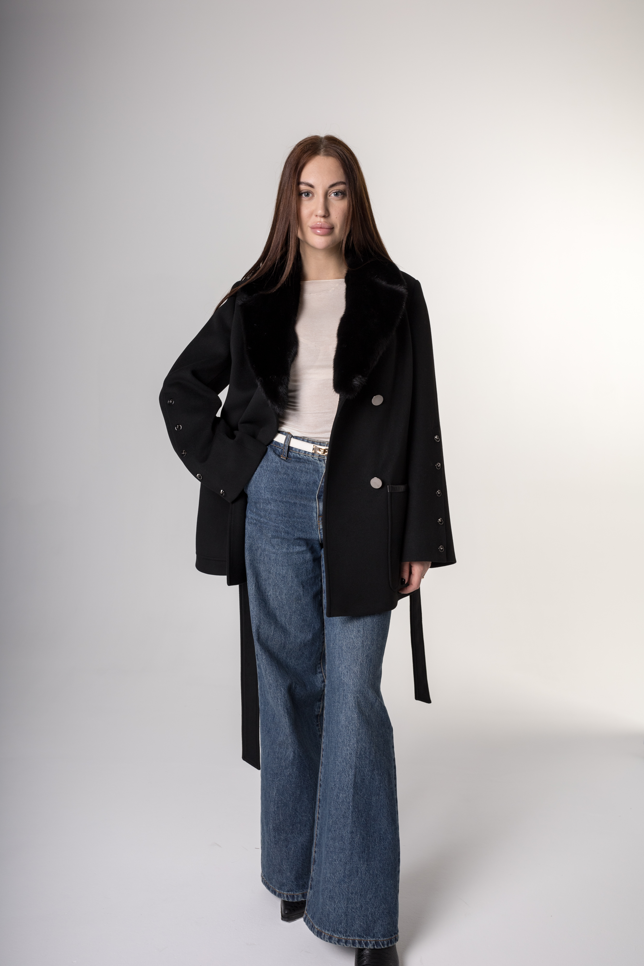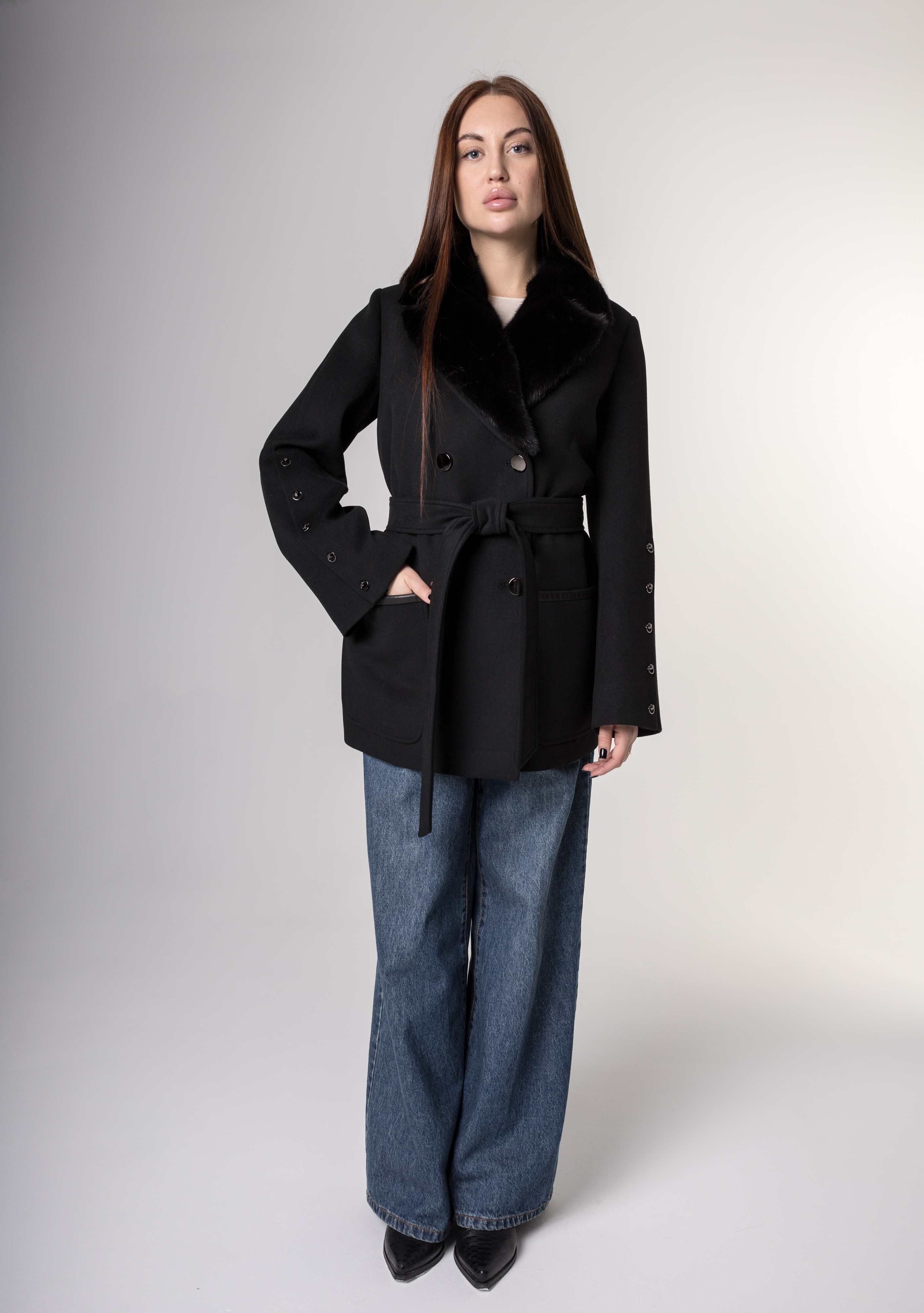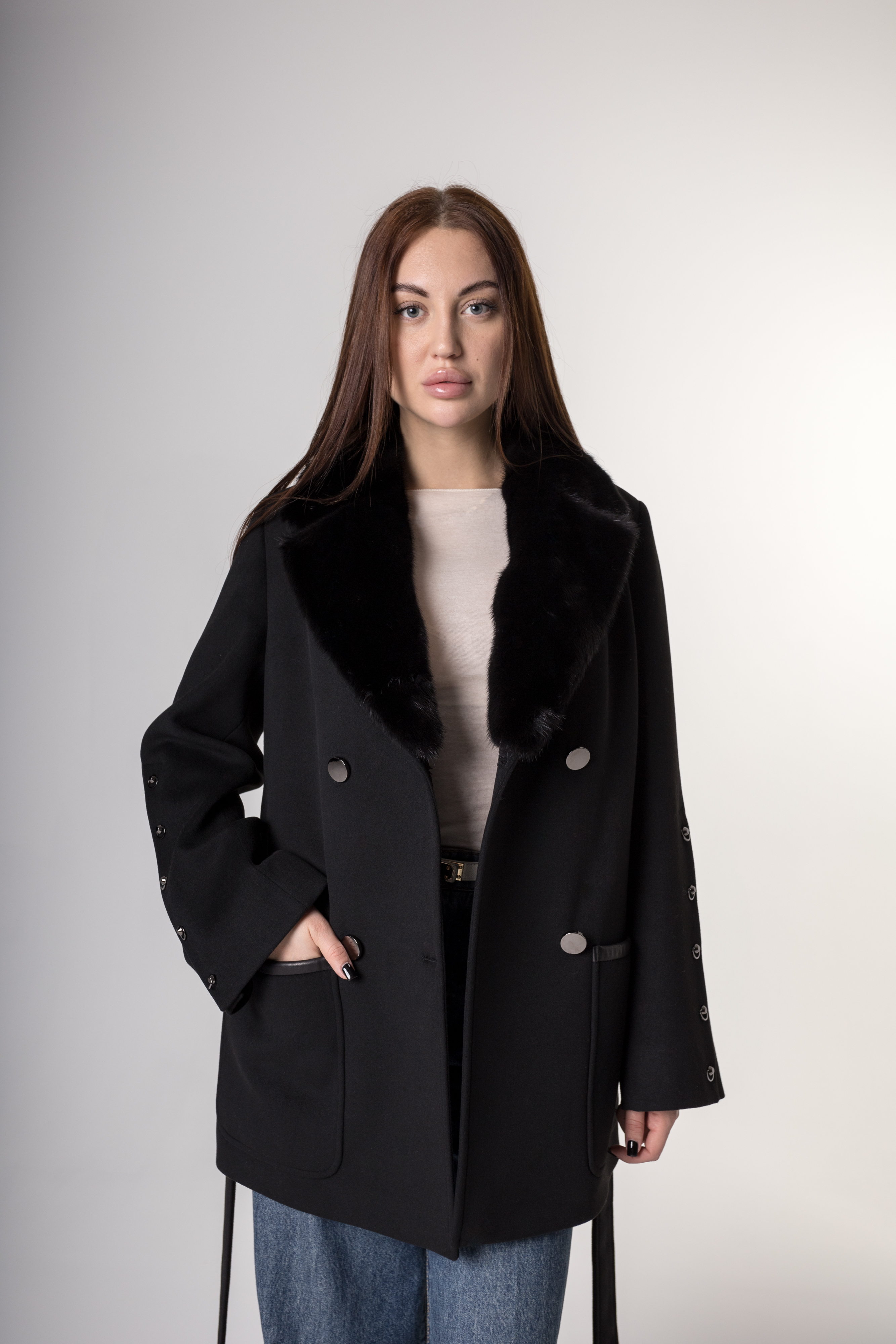 Полупальто из натуральной шерсти черного цвета – воплощение элегантности и комфорта. Пуговицы придают изделию особый шарм, а съемный пояс позволяет подчеркнуть талию и адаптироваться под ваш стиль. Воротник из натурального меха норки добавляет престижа и тепла. Это изделие – безупречный выбор для холодного сезона, который подчеркнёт вашу индивидуальность и превосходный вкус!