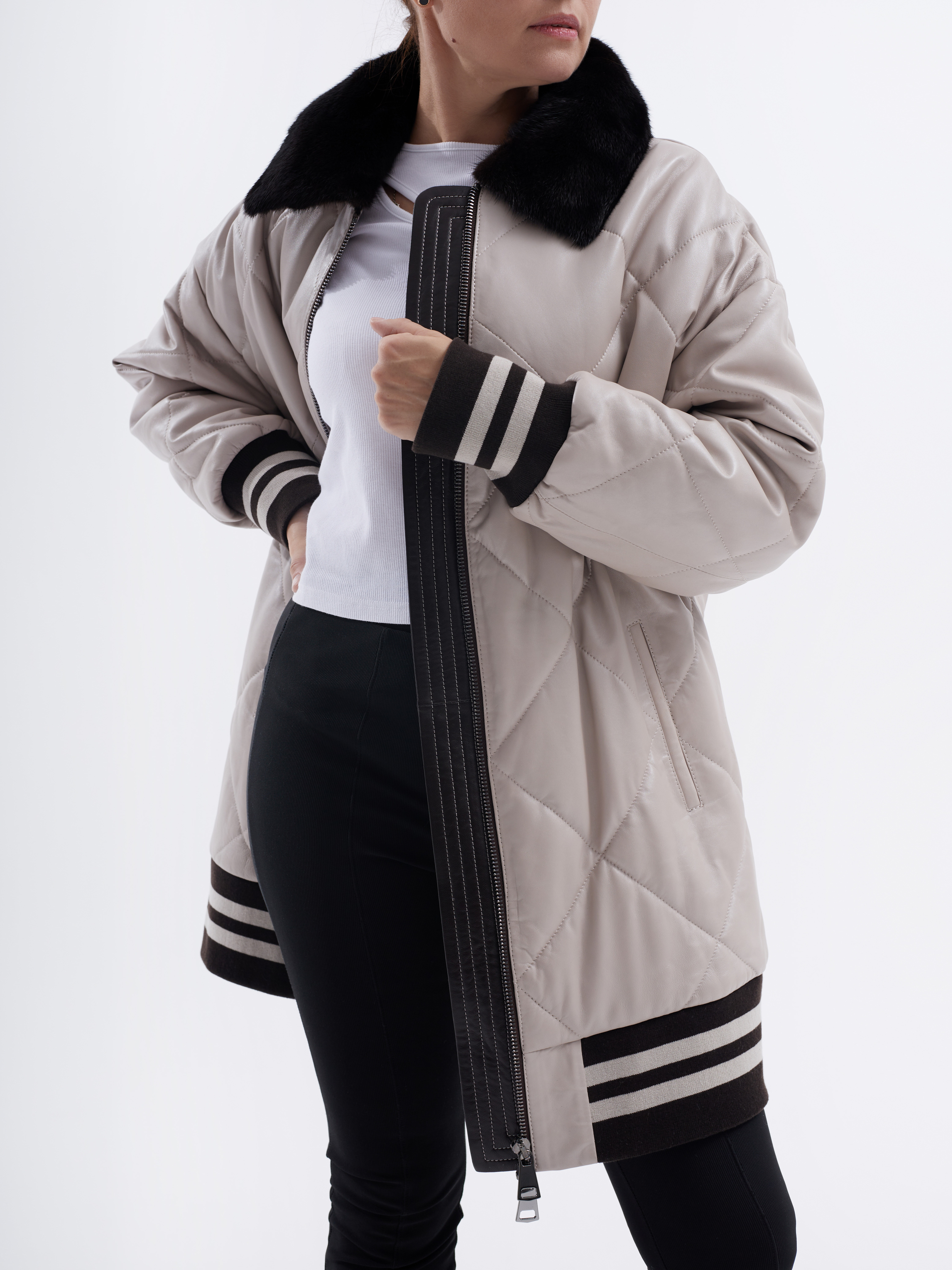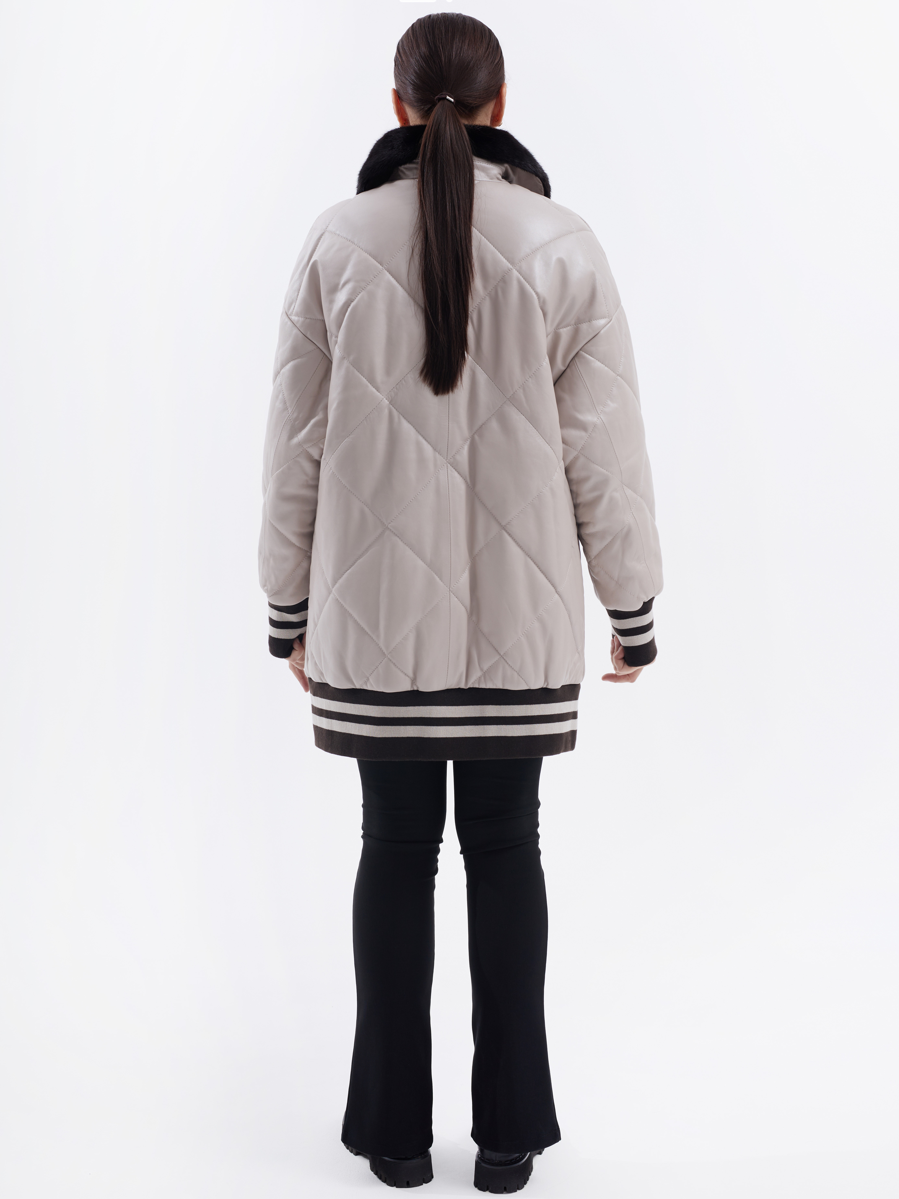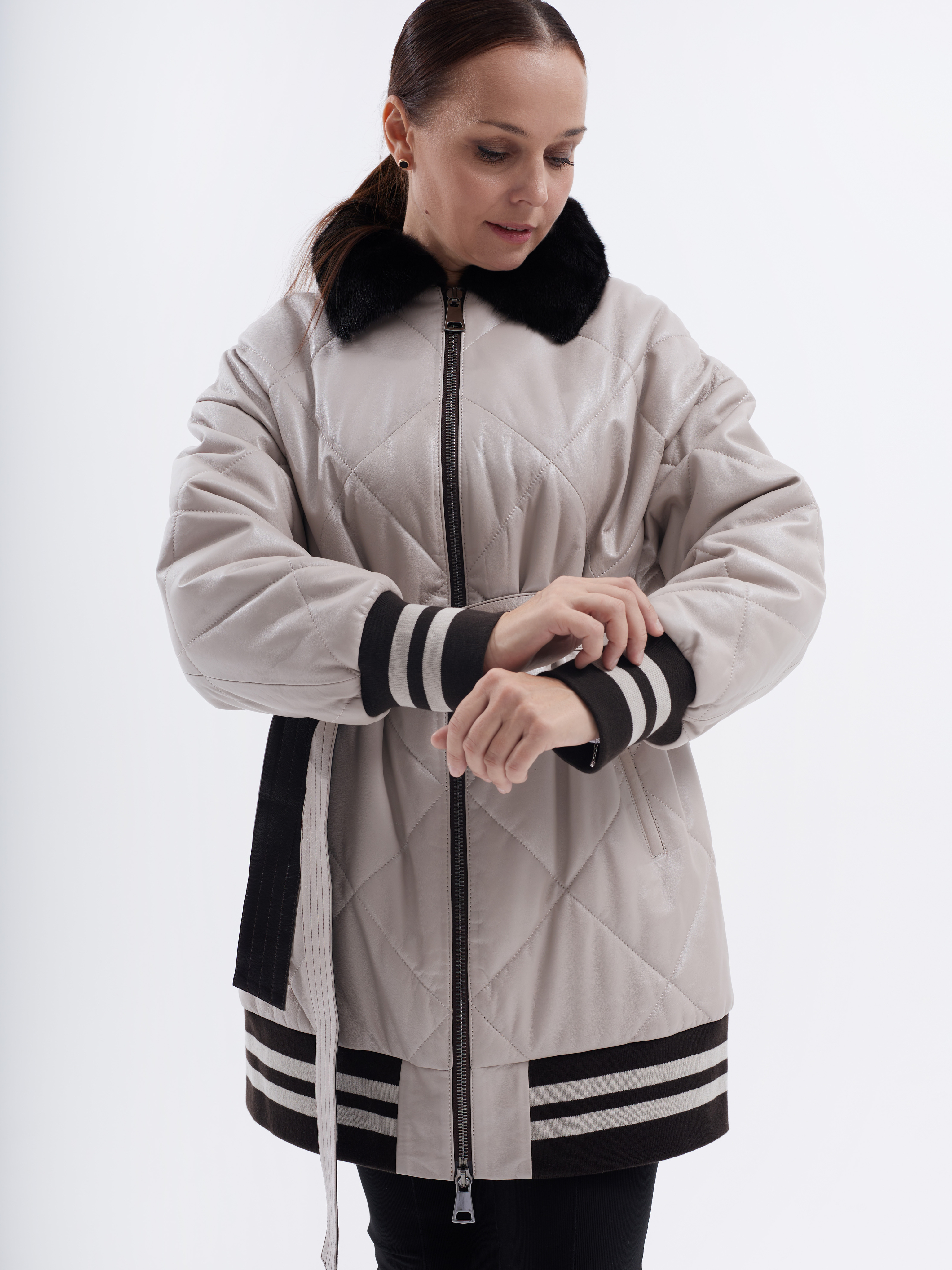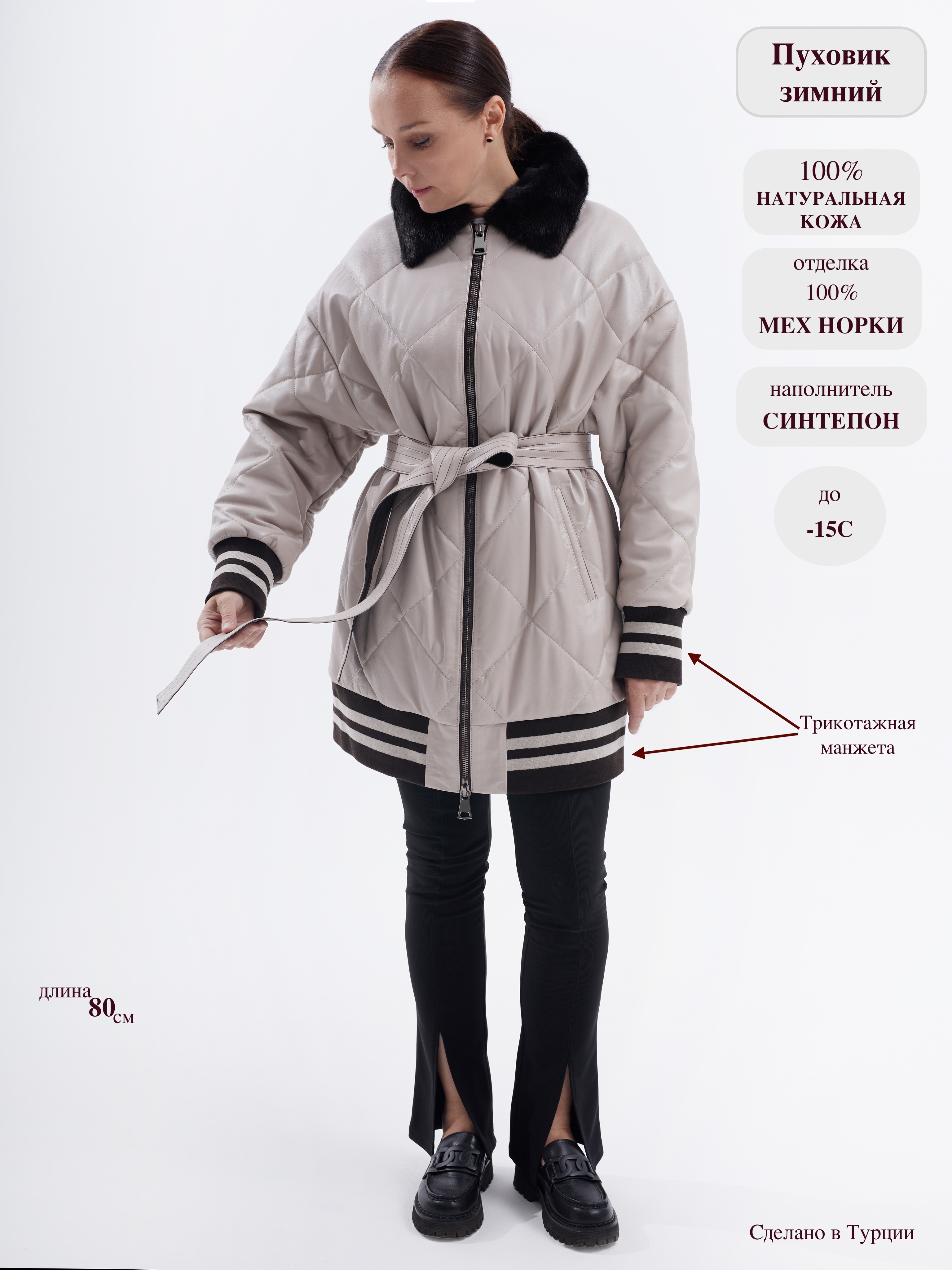 Верхняя одежда из мягкой натуральной кожи бежевого цвета с наполнением из высококачественного синтепона – тепло и комфорт даже в самые морозные дни. Стильный крой, пояс для акцента талии и модный стеганый дизайн делают этот пуховик идеальной инвестицией в ваш зимний гардероб.